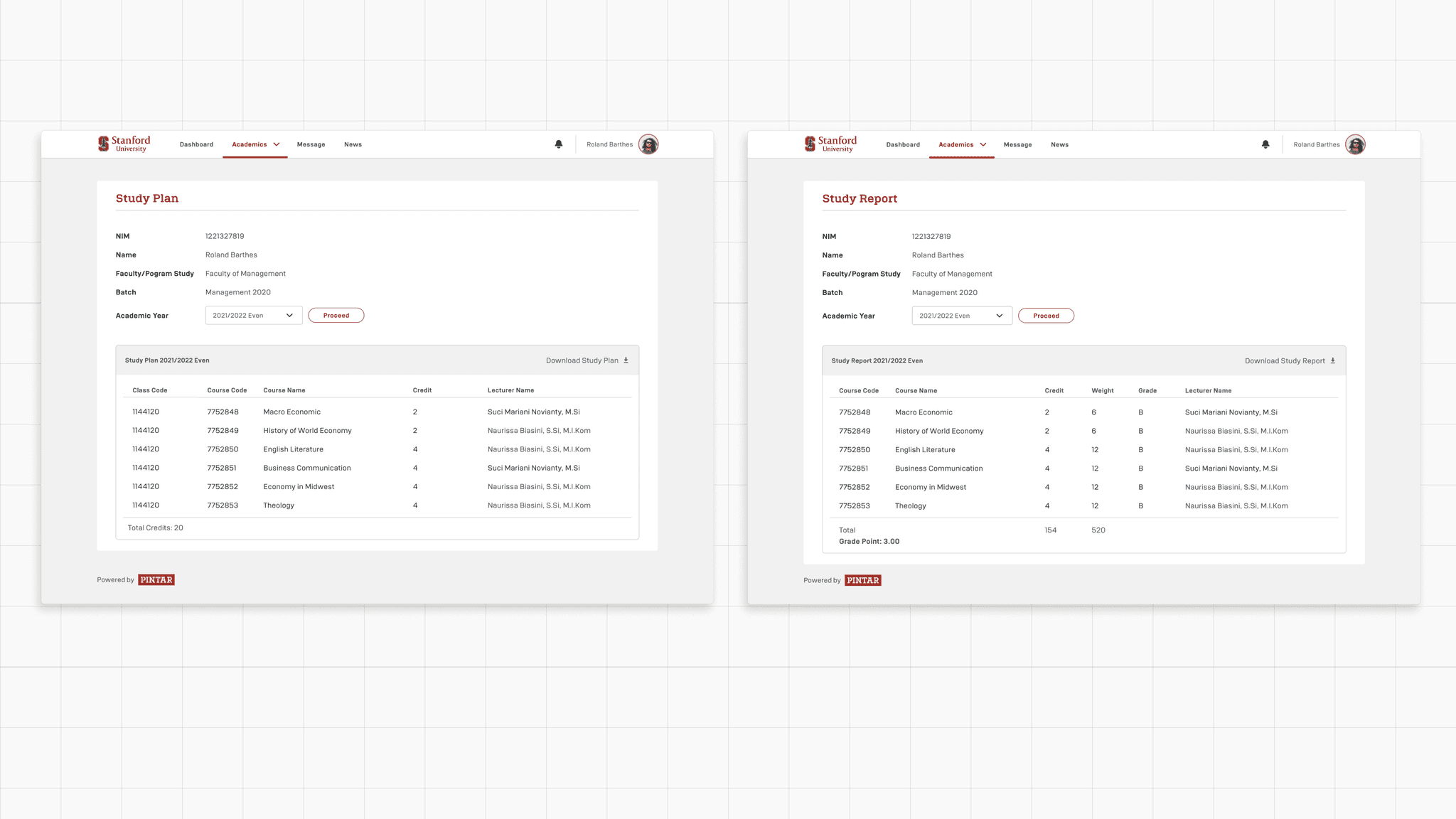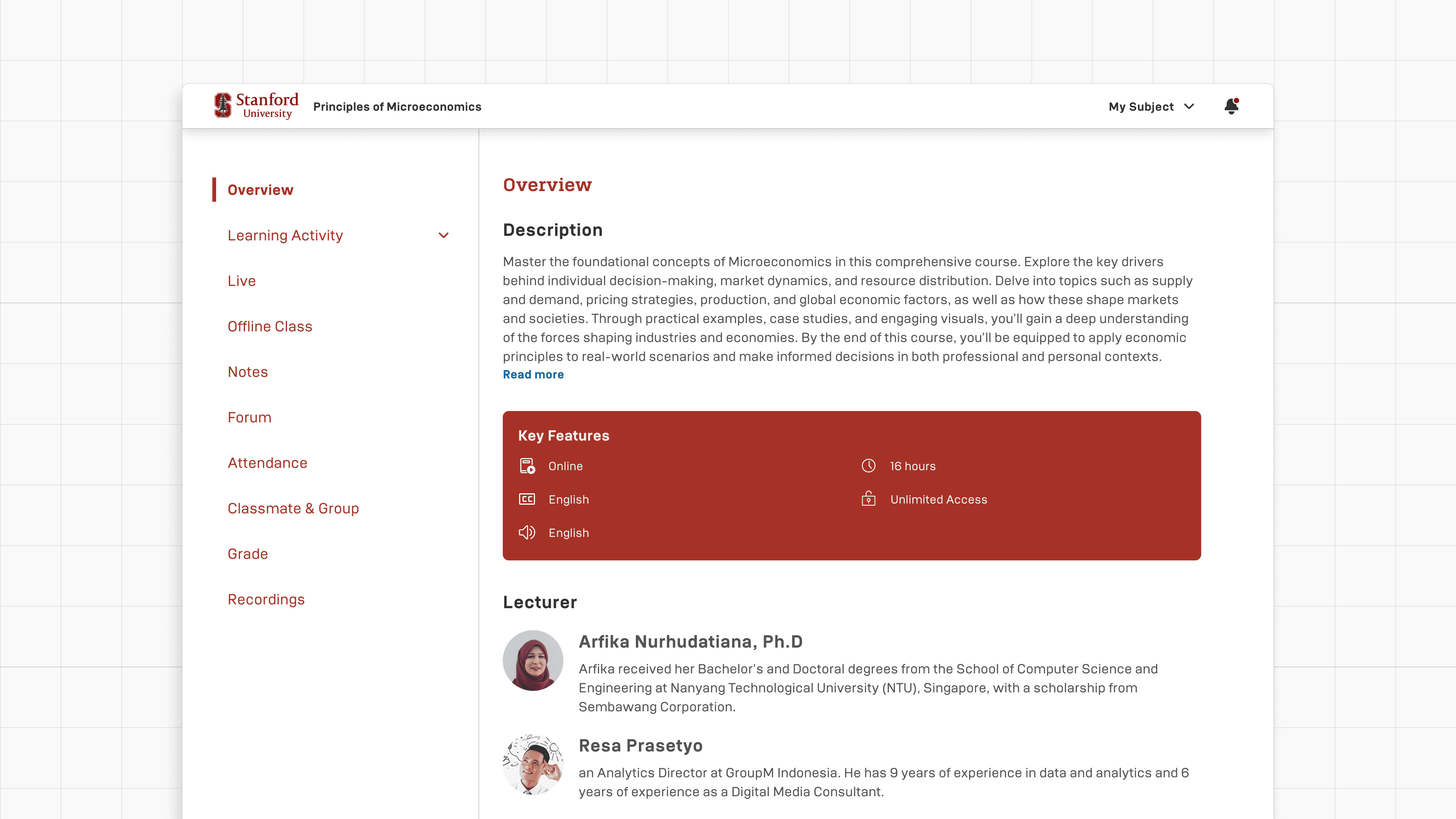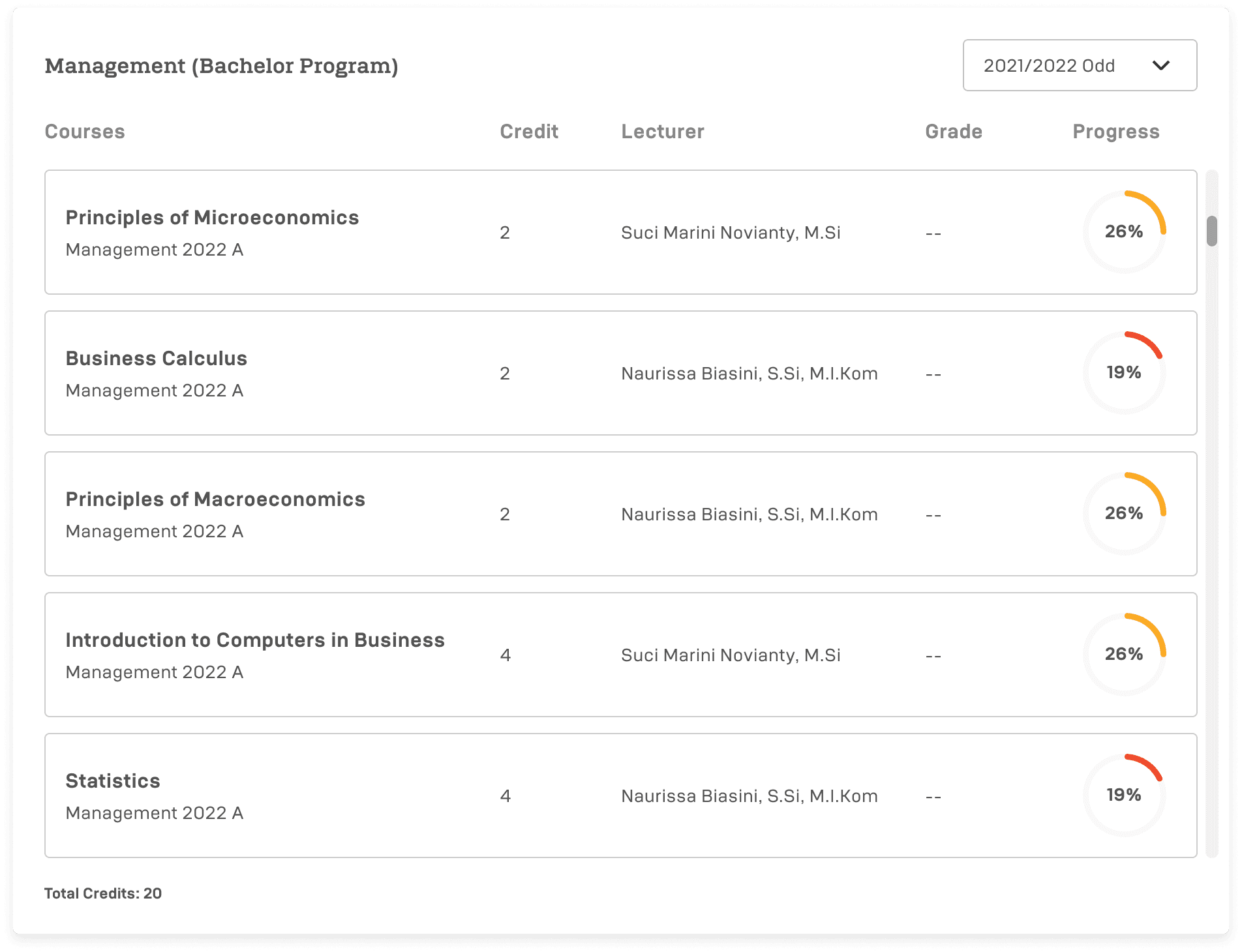 This screen is where student operate most of their activities. They can see active class, change the semester to revisit past activities, check today's agenda, monitor assignment, see taken course and grading, and more.