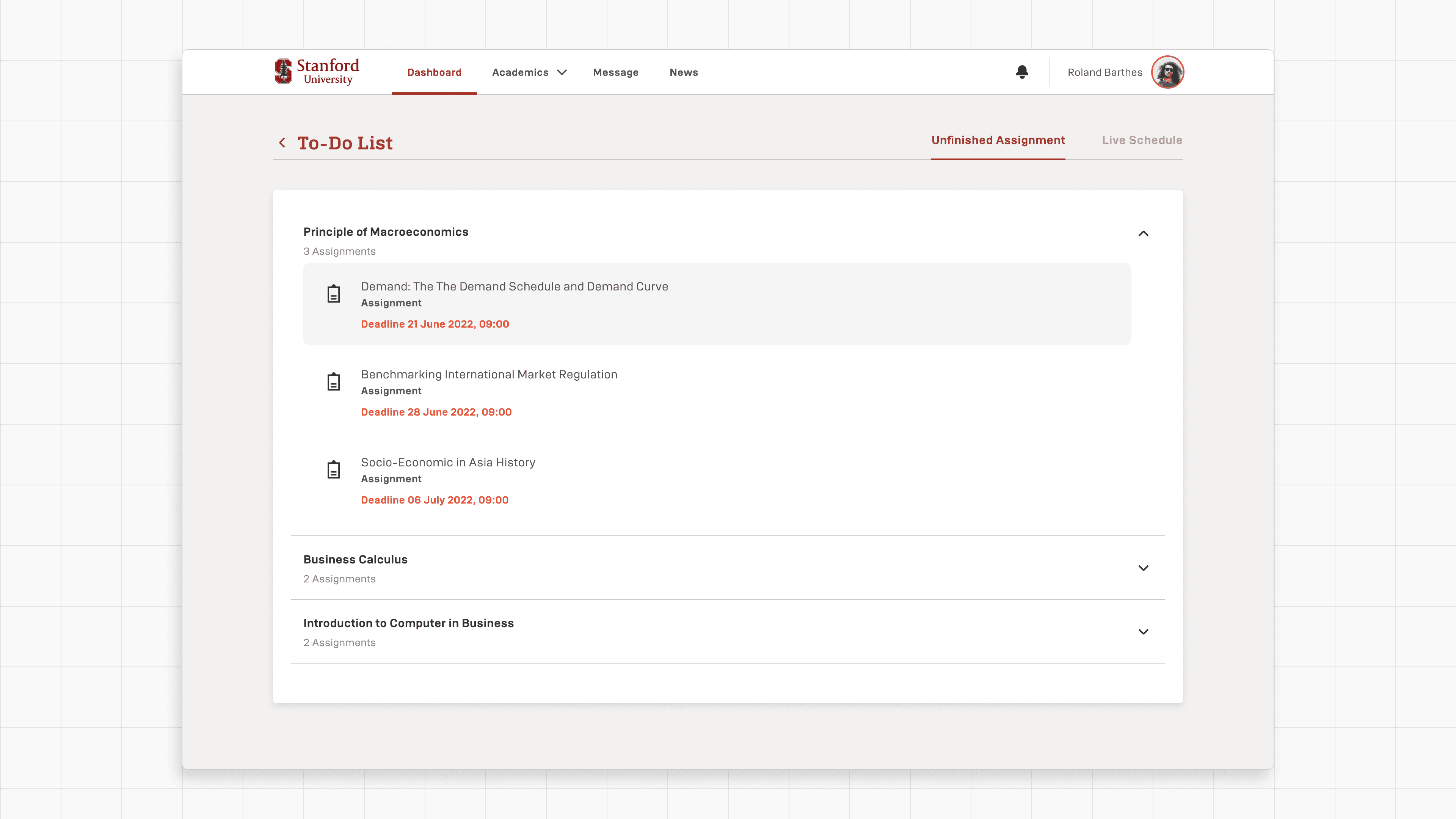 Show unfinished assignment list; which assignment or task they haven't finished, and see upcoming live schedule.